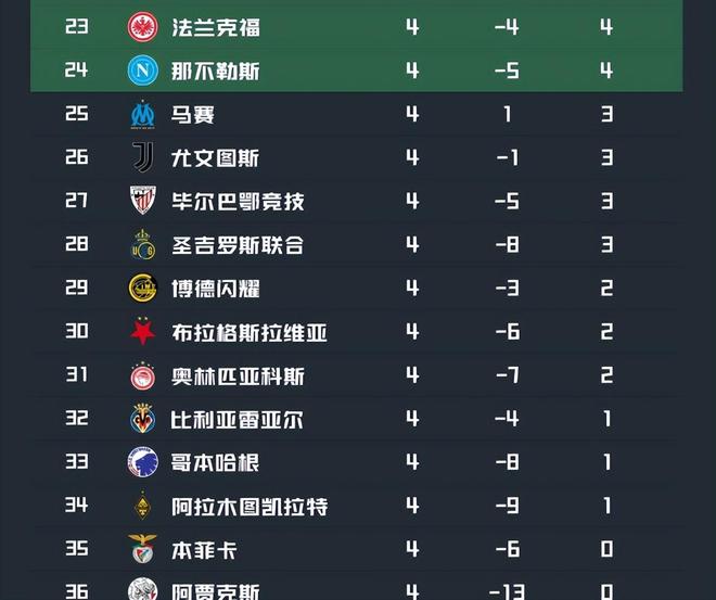 而其他意甲球队就没有那么出色的成绩了,亚特兰大4轮过后7分排在第16,已经是仅次于国米之后的最好的成绩了。至于上赛季的意甲冠军那不勒斯,不仅上轮被荷甲的埃因霍温爆锤了一个6:2,而且4轮4分排在第24,卡在附加赛的区域。而尤文图斯4轮过后更是没有获胜,第26名位列淘汰赛。