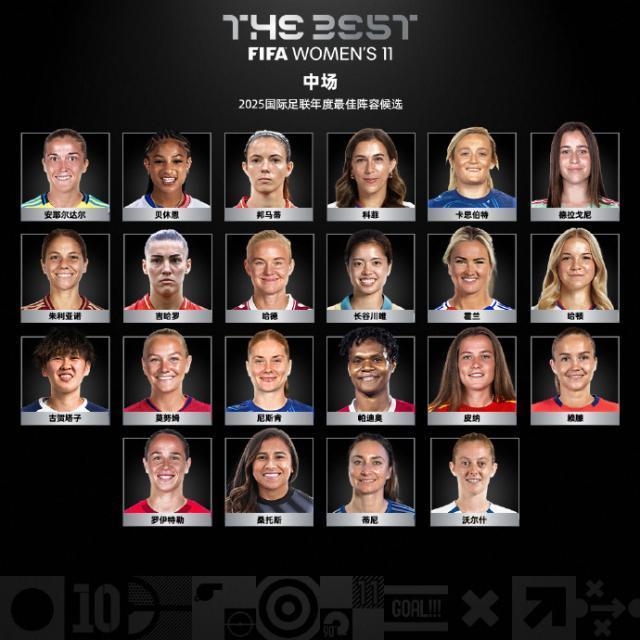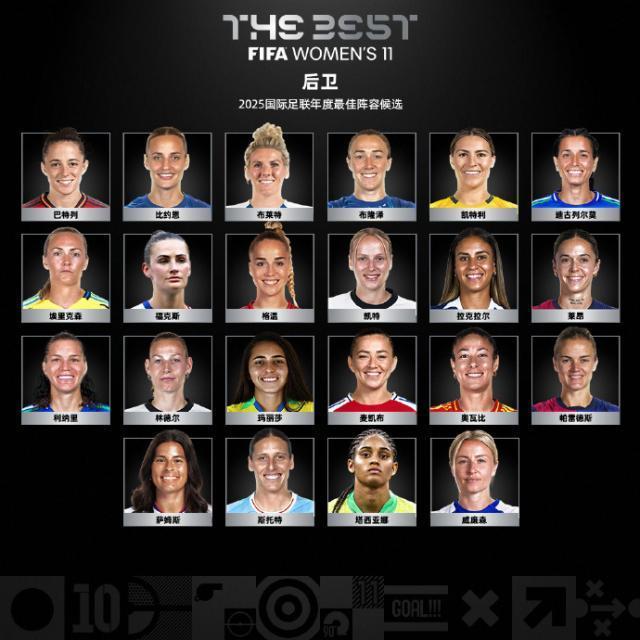 国际足联(FIFA)公布2025年度各项集体及个人大奖候选名单,名单由国际足联及其他足球相关机构代表组成的专家小组制定。其中男子最佳球员(足球先生)11名候选、女子最佳球员17名候选;男子最佳门将8名候选、女子最佳门将7名候选;男子最佳教练7名候选,女子最佳教练5名候选;男女子最佳阵容各个位置分别22名候选。