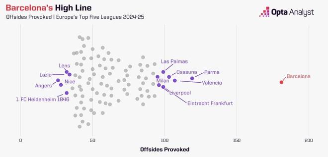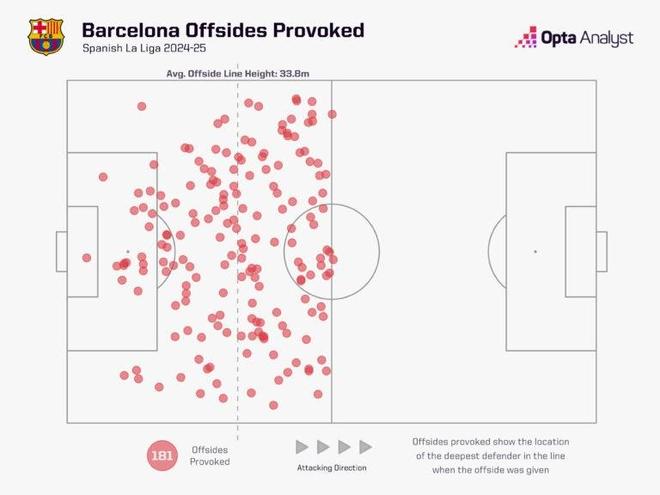 本赛季西甲赛场,巴萨制造越位的位置平均距离自家球门31.6米,相比2024-25赛季的33.8米略向内收。上赛季,这一平均距离比西甲其他所有球队都远出2米,位居联赛第一;而本赛季,他们在这一数据上落后于皇马(34.6米)和马竞(32.6米),但制造的越位次数却分别比这两支球队多了46次和44次。
